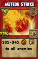 Yes, Meteor Strike, which allows me to blast ALL my foes into a fiery oblivion all at once instead of blowing them up one at a time with Sunbird. 345ish damage base, but with a few well placed damage buffs I can increase that significantly. It’s even more fun to use it against ice school foes – you can almost hear a frightened little ‘meep’ as the heavens open and giant fireballs rain down upon them…