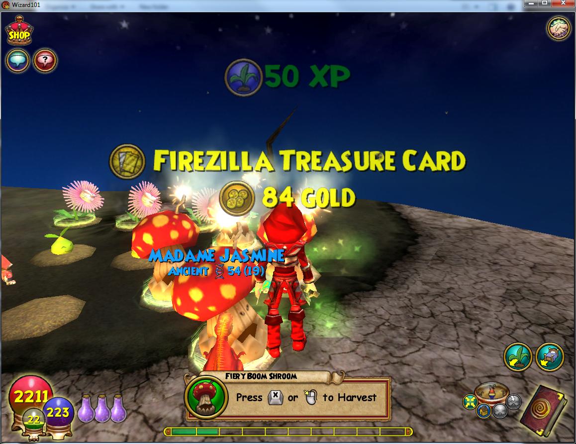 So I’m back to gardening, rank 8, and I’m finally harvesting Firey boom shrooms! I love these plants – they’re adorable and they give some pretty amazing treasure cards. I’m regularly harvesting Earthquake, Tempest, and Firezilla, which are handy to have in a duel AND seem to sell pretty well in the bazaar as well if you catch it right.