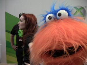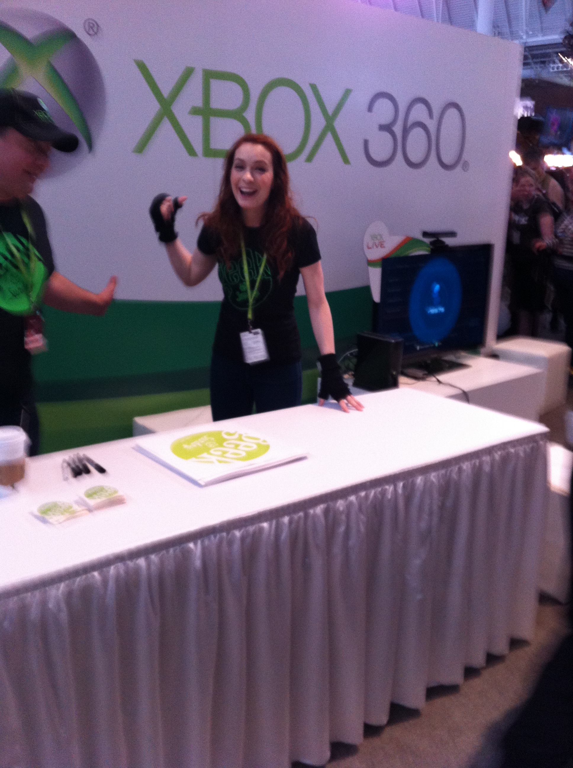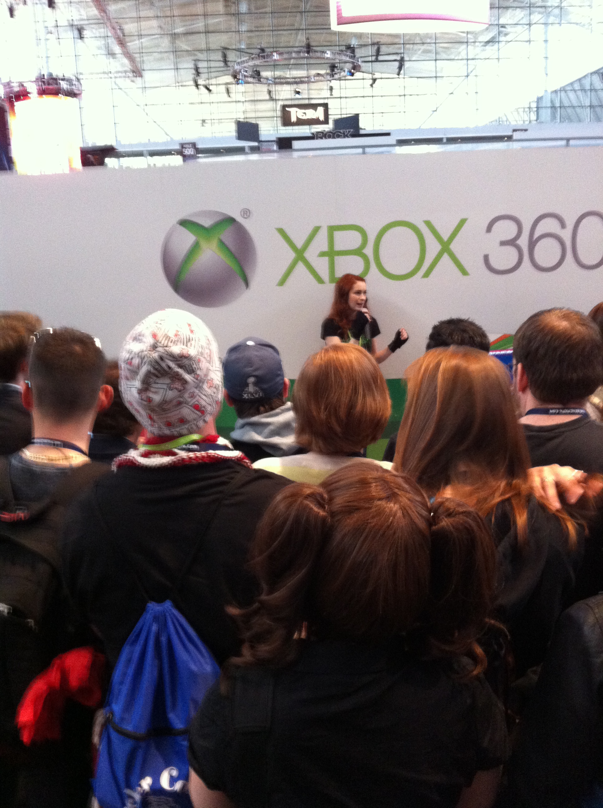 We showed up a bit early for the Q&A, but not NEARLY Early enough – there were throngs of people surrounding the XBox Live stage area, and when Felicia came out I could barely see her, and we couldn’t hear her at all. I kept trying to get a look, but Ditto is very short, and people are very tall, so it wasn’t working. Finally, Miss Narrator agreed to put me on her shoulders – OK, I bribed her with a stuffed dinosaur – and I finally saw Felicia standing there talking.