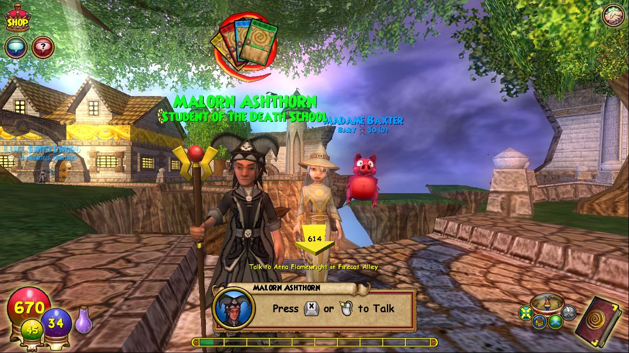 As a quick recap, I am playing a new character in Wizard 101, Destiny, who will not use anything but the starter deck, wand, and robes she was given upon entering Ravenwood, going through the game with only starter equipment. It’s an interesting challenge and really makes you think about the game in a whole new way and I’m already asking questions like ‘How am I going to win boss fights using only 14 cards and 5 treasure cards??’