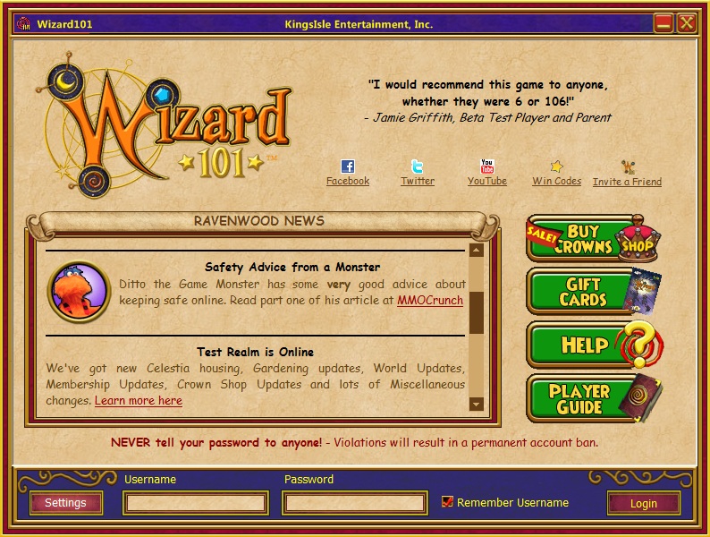 The best part of this is that the whole point of me taking the gig at MMOCrunch (which is a wonderful publication run by kind and dedicated gamers, by the way) and writing these articles was to help people, especially younger people, stay safe online. By posting my article on the launcher like this, KingsIsle and Wizard 101 are helping to get the word out that safety is important for everyone, and I REALLY appreciate that!! THANK YOU KINGSISLE!!