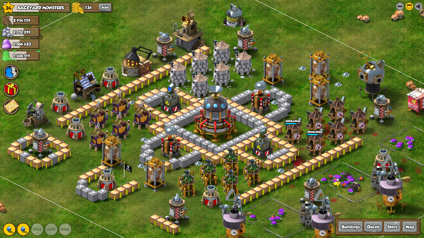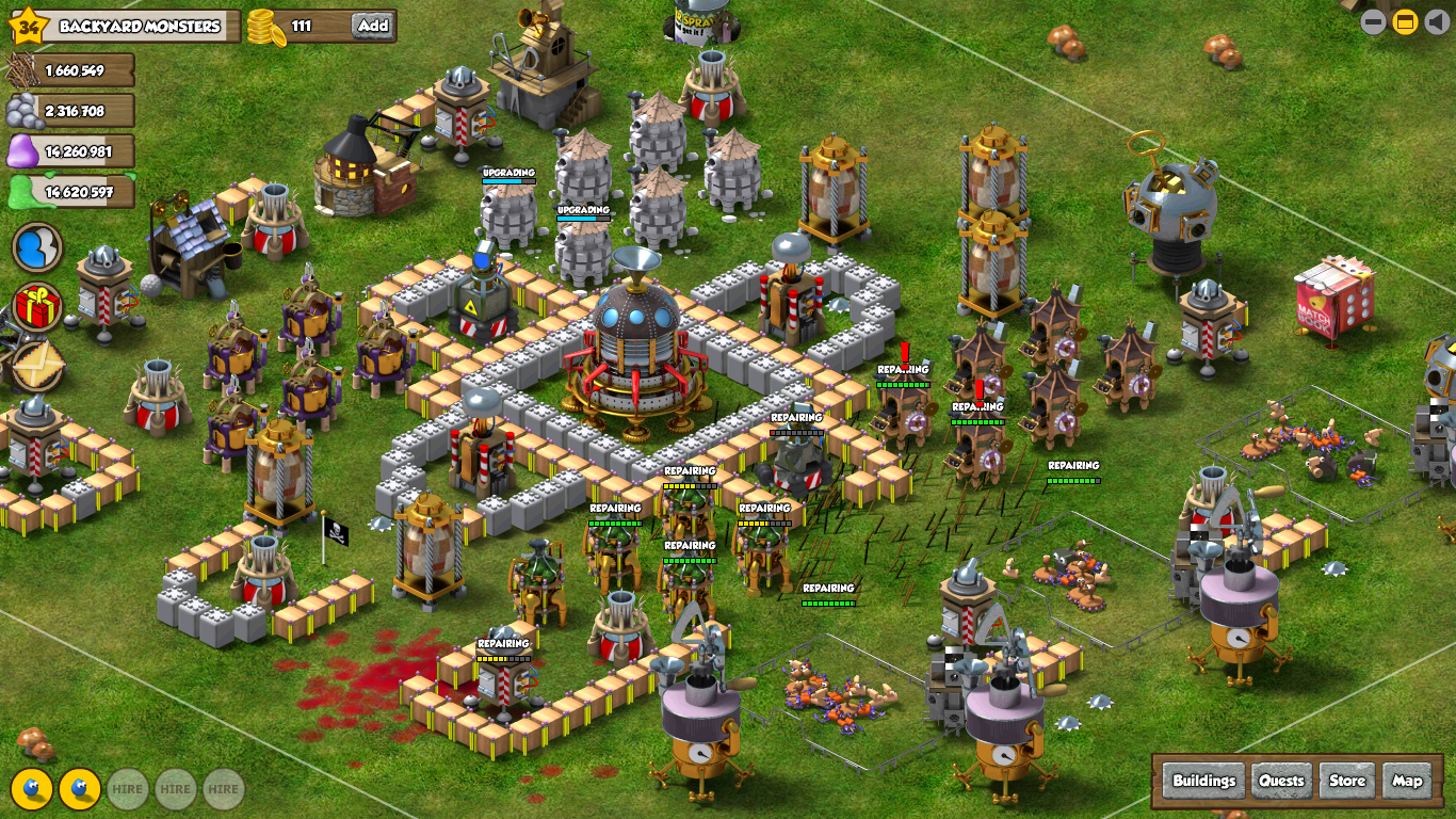 Big re-design of my yard this week and though I am taking a bit more damage to my outer buildings in this configuration, no attackers have even gotten close to my town hall or my core buildings, which is the main point now. So far it’s working out really well for me, though I think I’ll continue to tweak it. The PvP aspects here are interesting because when you’re attacked you don’t have any way of interacting or preventing damage outside of the defenses you’ve prepared in advance. It’s all about the strategy of your yard and how you’ve set up your towers and lasers. Yup – still fun, I play at least once a day…