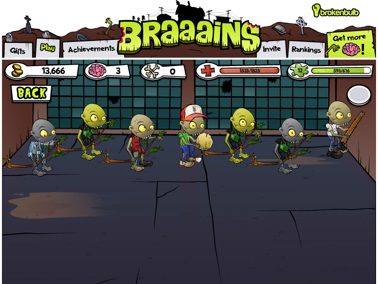 So last week I found a fun, really entertaining game called Braaains on Facebook. It was cute, it had zombies, it was fun and easy to play, but still a bit challenging. I’ll admit it, I got hooked on it – I’ve played every day since last week, sometimes logging in multiple times to check in on my terrifying Zombie horde…