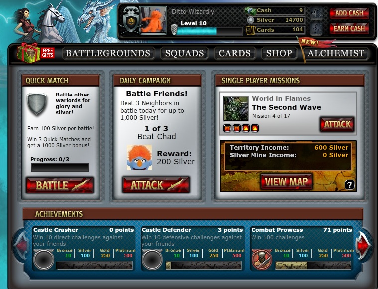Winning battles moves you farther along the quest/storyline you’re on and captures a new part of the map. Areas that are fully under your control produce silver, which you can spend to buy more cards. Sometimes (OK, daily), barbarians can ‘invade’ a part of the map you already hold, and if you don’t repel them, they’ll stop your silver production and just be annoying in general. There is also the standard real-money transaction currency, and in most cases either currency can be used to buy better cards, pre-made squads, or more content/quest packs – again, nothing groundbreaking, standard free to play and social gaming fare.